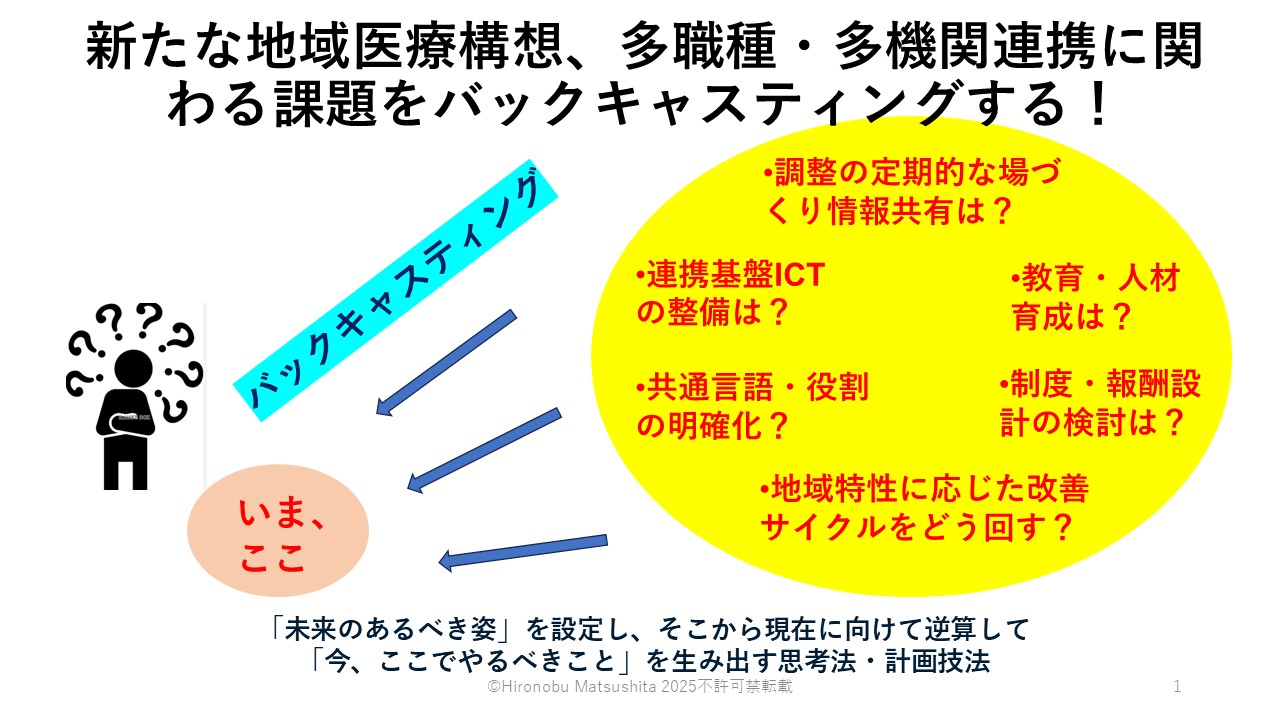 まず理想の未来像を設定し、そこから現在まで逆算して必要な手順を組み立てる。この場合、「新たな地域医療構想」が理想の未来像となる。
