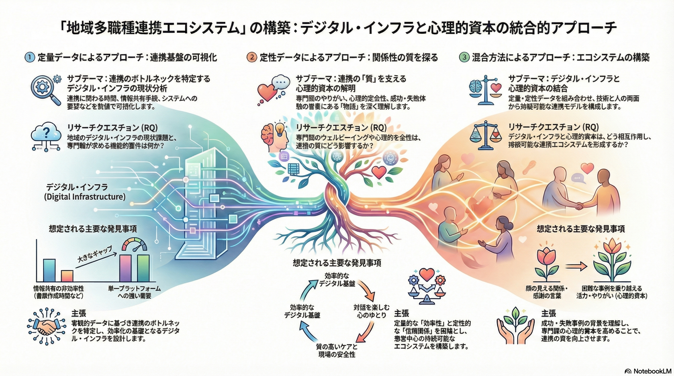 まず定量論文で、システムと対話の重要性を数字で証明し、学術的な「骨組み」を作る。 次に定性論文で、現場の生々しい声(痛みと願い)によって「肉付け」する。 最後に混合研究論文で、両者を統合し、「システムと人間性」がいかに現場でせめぎ合い、補完し合っているかという洞察を吹き込む。